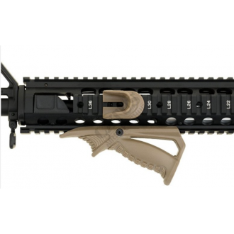 L'un de ses principaux atouts réside dans la possibilité d'appuyer l'arme contre un obstacle (par exemple, un mur), la poignée assurant un support stable – idéal pour les tirs de précision et les situations tactiques. Son installation est simple grâce à un système de verrouillage robuste sur un rail RIS standard de 21 mm , garantissant une fixation fiable et sans jeu.
